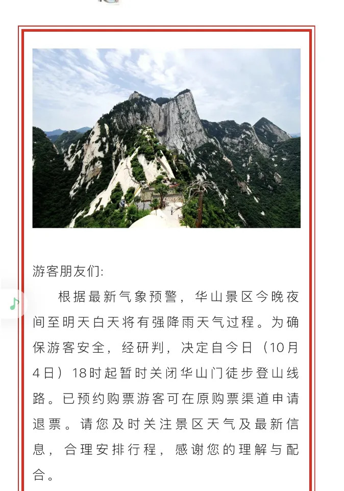10月4日18时,华山景区发布通告称,根据最新气象预警,华山景区今晚夜间至明天白天将有强降雨天气过程。为确保游客安全,经研判,决定自今日10月4日18时起暂时关闭华山门徒步登山线路。已预约购票游客可在原购票渠道申请退票。